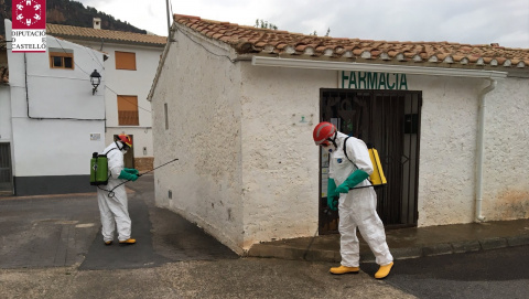 [Img #40566]Una dotación formada por cuatro bomberos y un mando, equipados con los equipos sanitarios correspondientes, ha estado trabajando durante dos horas en este municipio del Alto Mijares, pueblo que registró hace unos días el primer caso de coronavirus, lo que había llevado a su alcalde a pedir ayuda a la Diputación para desinfectar sus calles.