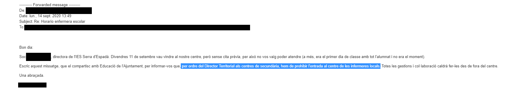 Las enfermeras escolares de Onda, que puso en marcha el Ayuntamiento de Onda durante el pasado curso, han sido expulsadas esta mañana de los centros educativos a los que prestan servicio por orden expresa de la Conselleria de Educación de la Generalitat Valenciana. Así, siguiendo las directrices del director territorial de Educación, Alfred Remolar, como se confirma en un mail, las directoras de los colegios e institutos han comunicado a las profesionales que no pueden acceder a los centros y que deben realizar su trabajo, llevando a cabo el programa de educación en salud y prevención, de puertas hacia afuera.