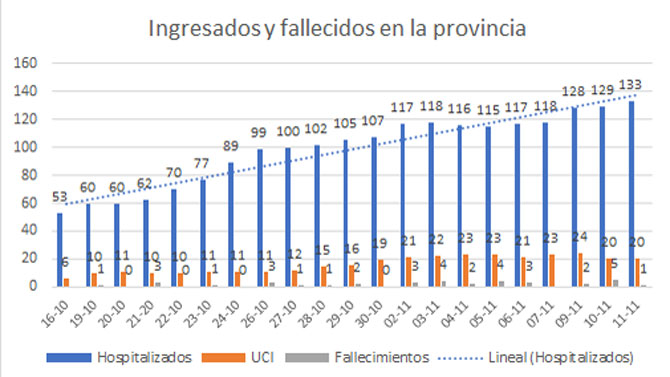 Los hospitales valencianos tienen, actualmente, 1.530 personas ingresadas: 133 en la provincia de Castellón, con 20 pacientes en UCI; 504 en la provincia de Alicante, 88 de ellos en la UCI; y 893 en la provincia de Valencia, 140 de ellos en UCI.