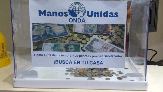 Manos Unidas ha puesto en marcha la campaña “Tus pesetas pueden salvar vidas” mediante la ubicación de urnas a disposición de la ciudadanía, para que las personas que quieran colaborar puedan depositar pesetas, ya sea en monedas o billetes, y contribuir así a la recaudación que servirá para financiar los proyectos que tiene en marcha esta ONG.
