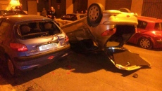 Un conductor que circulaba por la calle Ausías March volcó anoche su vehículo tras chocar contra varios vehículos que estaban estacionados en la calle Doctor Fleming.