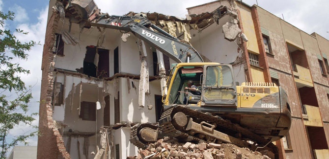 Las Cases dels Mestres están a punto de ser historia, solo historia. Las máquinas empezaron este miércoles a derribar el edificio que sirvió de vivienda a los maestros del colegio Pío XII, demolido en 2010 para construir el actual.