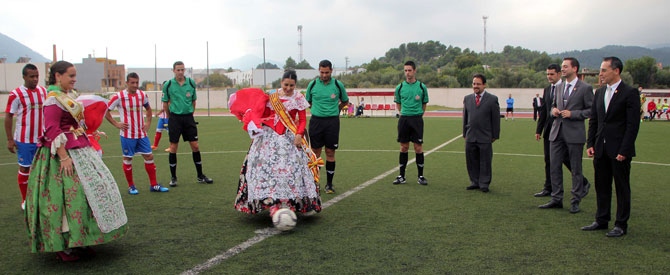 La reina de la Fira 2015, Cristina Llorens, ha hecho esta tarde el saque de honor del partido de primera regional preferente, que enfrentaba al CD Onda contra el Alqueries CF A, en el Olímpic, rodeada del alcalde Ximo Huguet, el concejal de Fiestas, Asensio Blaya, el concejal de deportes, Francisco Chalmeta, el presidente del club local, Mauro Barea, y miembros de la plantilla.