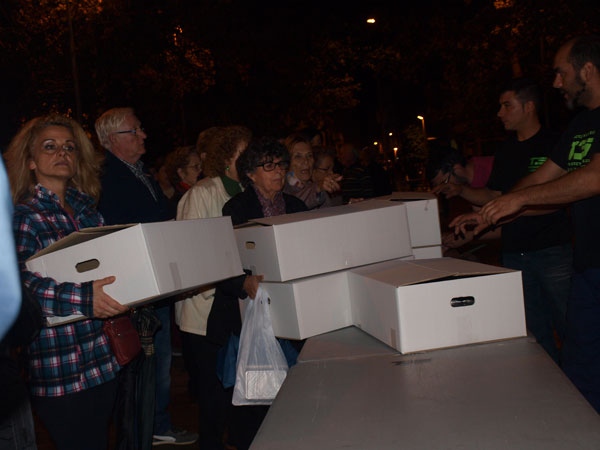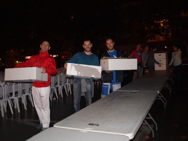 La cena de peñas también se ha visto alterada por la lluvia. Cada peña ha podido recoger el tradicional "tombet de bou" pero la mayoría han decidido llevarselo para degustarlo en los casales, aunque no ha faltado quien, fiel a la tradición, ha cenado en las mesas y sillas que el Consell de Festes había instalado junto al pabellón Victor Cabedo. Este año 5 mil personas se han apuntado a una de las citas más multitudinarias de las fiestas para degustar hermanados el tombet de bou.