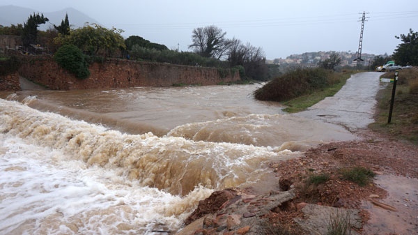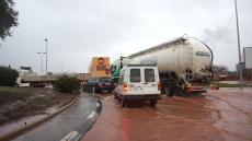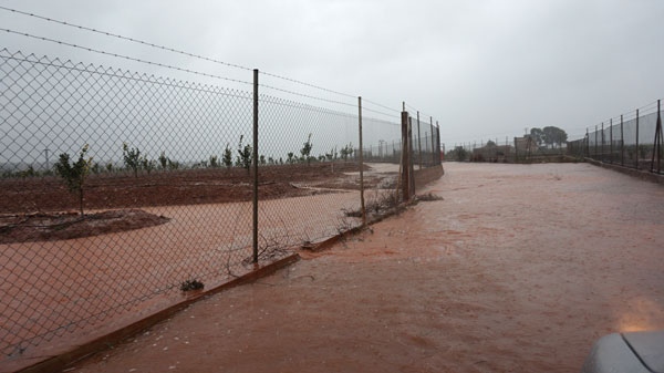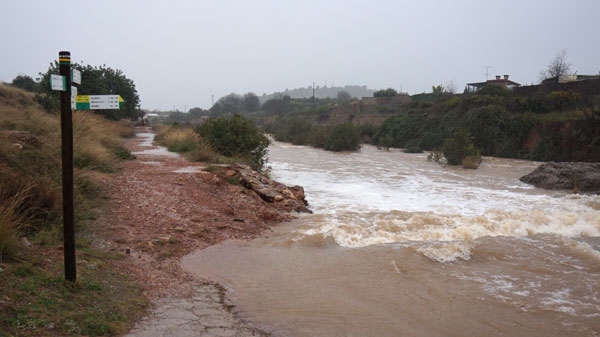 Tránsito complicado en carreteras y caminos de Onda. El temporal ha obligado a la Policía Local a cortar algunos caminos, sobre todo los que cruzan barrancos y ríos, aunque en otras vías rurales también baja un gran caudal de agua. En la CV-20 también se están registrando varios problemas que afectan a la circulación. El río Sonella está creciendo por fuerza.