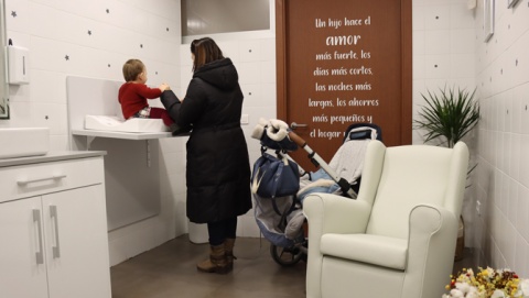 Se habilita un espacio íntimo y relajado con mobiliario, cambiador, microondas, nevera, lavabo y decoración infantil