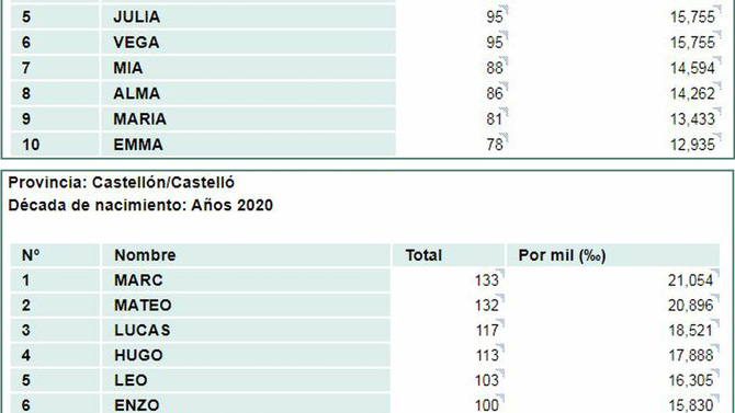 Los padres castellonenses escogen Marc, Mateo, ucas, Lucía, Martina y Sofía para los recién nacidos